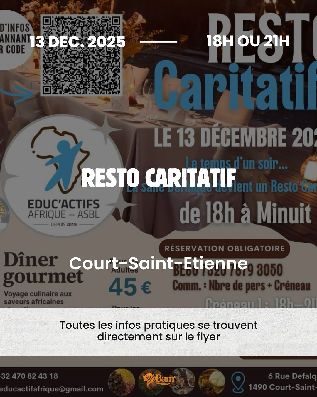 Les bénéfices de cette soirée seront reversés à Educ’Actifs Afrique ASBL pour soutenir leurs actions éducatives. Deux créneaux sont disponibles : 18h-21h ou 21h-00h. Le dress code est Chic & Culturel.