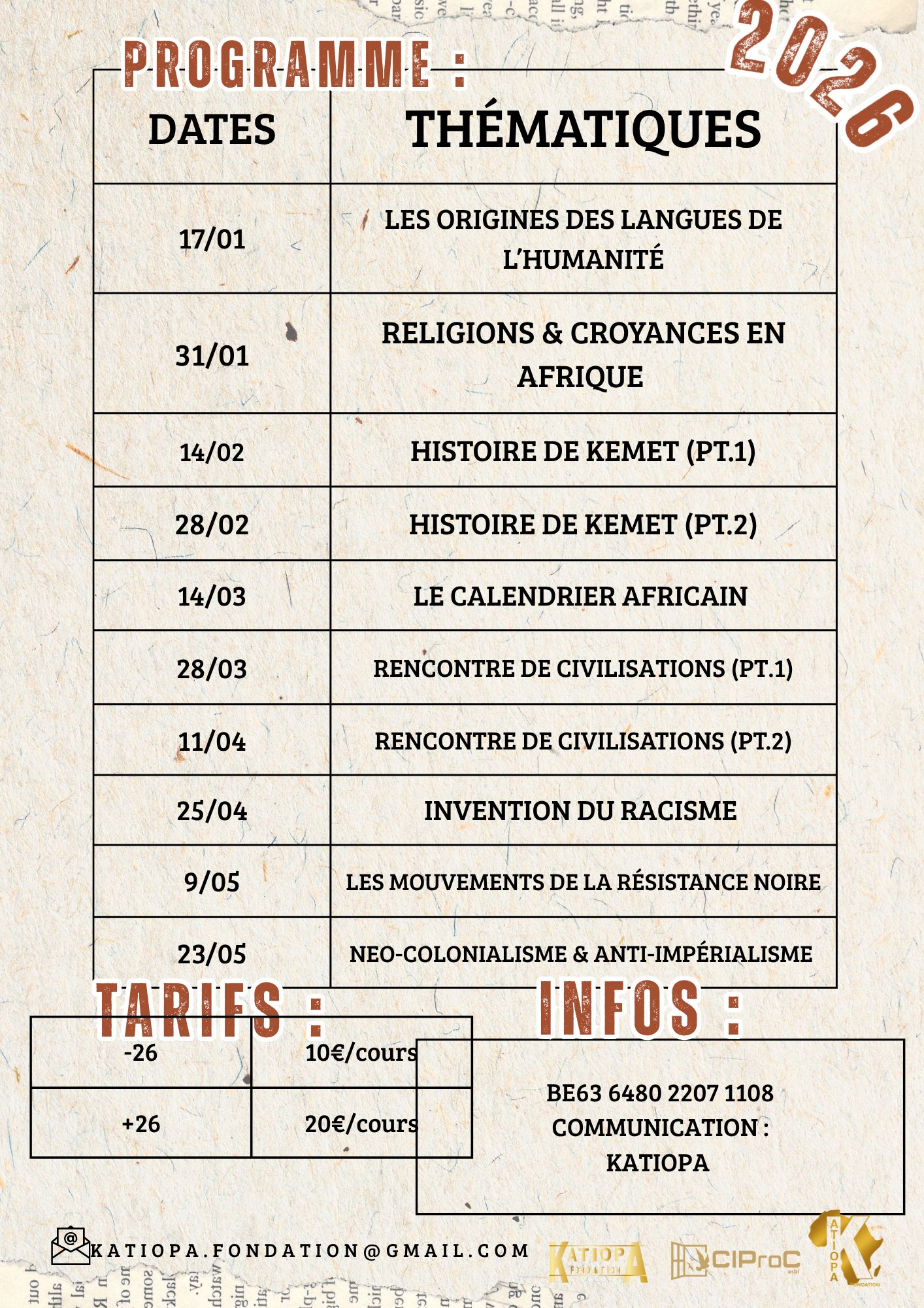 Cours d’histoire de l’Afrique 2026-2027 + Ajouter à mon Agenda Google + iCal / Outlook export Étiquettes : Cours d'histoire de l'Afrique 2026, KATIOPA FONDATION Date Jan 17 2026 - Mai 23 2026 Chargement... Heure 8:00 am - 6:00 pm Partagez cet événement